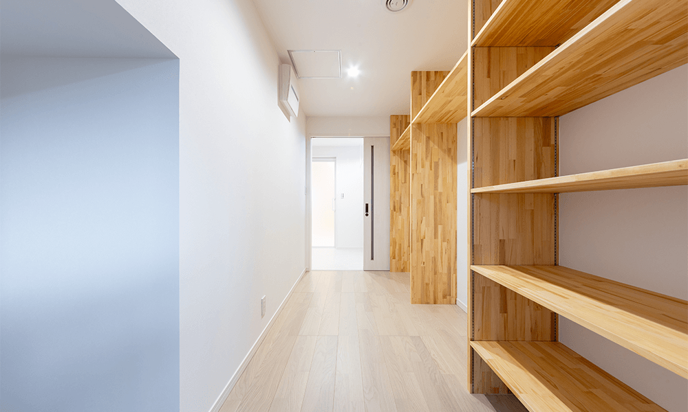 2帖から3帖のファミリークローゼットは、家族4人分の衣類をまとめて管理できます。各部屋に収納を分散させる必要がなくなります。洗濯後の衣類を持って階段を上り下りする動きも不要になります。
