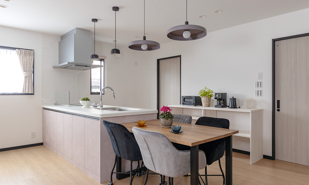 キッチンカウンターの上にペンダントライトを設置すると、カフェのような空間になります。