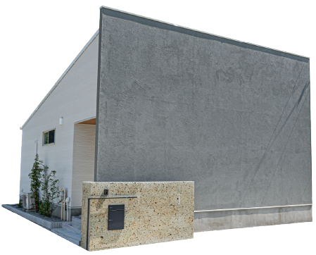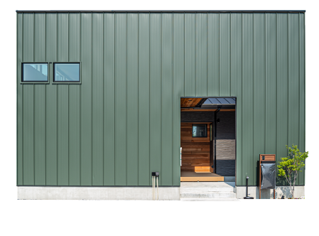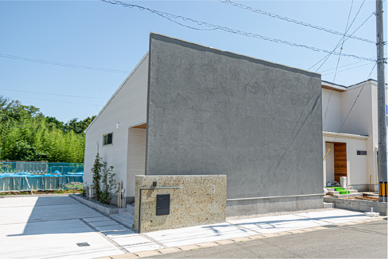 正面に設けた大きな壁は、見せたいものを引き立て、外からの視線を遮ることで、周囲の景観に左右されない心地よい空間を実現しています。